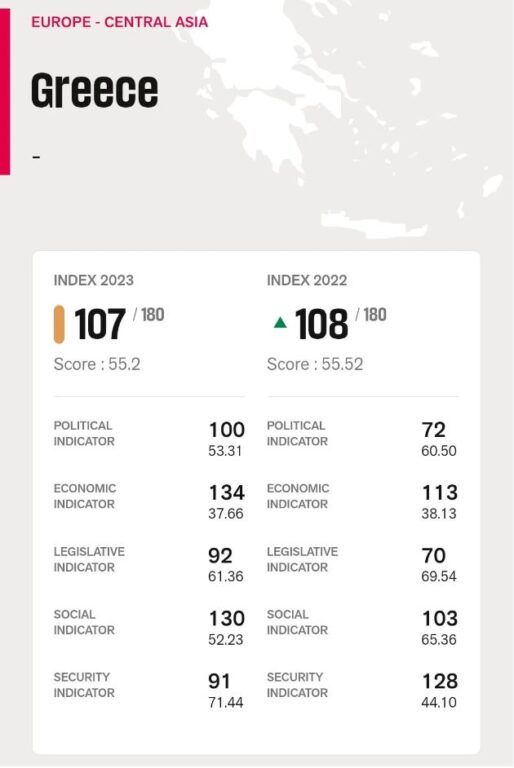 Ειδικότερα, η χώρα μας βρέθηκε στην 107η θέση της παγκόσμιας κατάταξης, με διαφορά 24 θέσεων από το αμέσως προηγούμενο κράτος-μέλος της ΕΕ, τη Μάλτα, που βρίσκεται στην 84η θέση.
