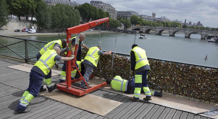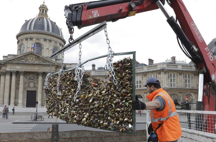 Οι αρχές ξεκίνησαν από χτες να αφαιρούν τους 45 τόνους λουκέτων που βρίσκονταν στη γέφυρα Pont des Arts στο Σηκουάνα. Τα σύμβολα των ερωτευμένων ζευγαριών για αιώνια αγάπη.