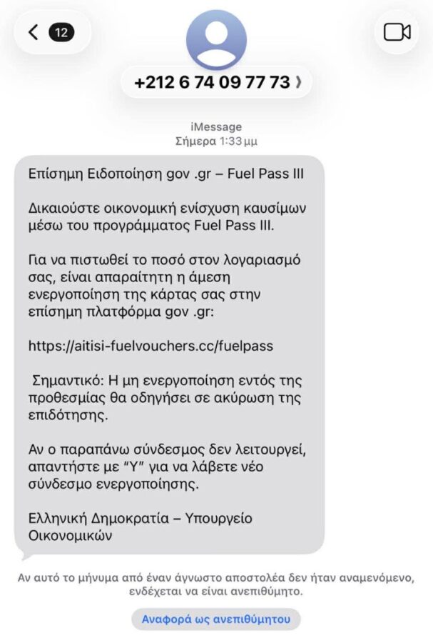 Ένα ακόμη SMS που αφορά το fuel pass στάλθηκε σε εκατοντάδες αριθμούς τηλεφώνων σε όλη την Ελλάδα. Το μήνυμα φαίνεται να έχει αποσταλεί από σταθερό τηλέφωνο, υποτίθεται από την ελληνική κυβέρνηση για ενεργοποίηση της ψηφιακή κάρτας στην οποία θα πιστωθεί το ποσό της ενίσχυσης.