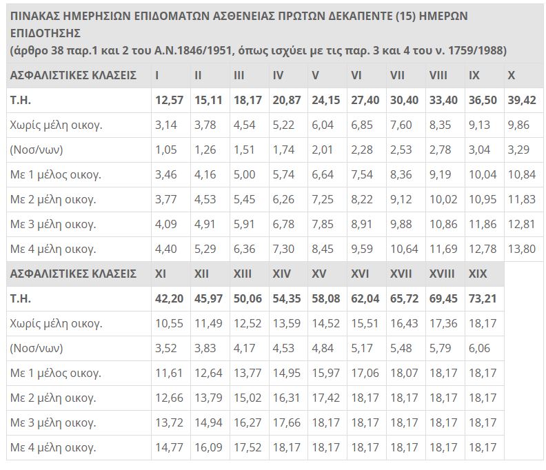 Παρακάτω παρατίθενται αναλυτικά οι πίνακες με τα ημερήσια ποσά επιδόματος ασθενείας και μητρότητας.