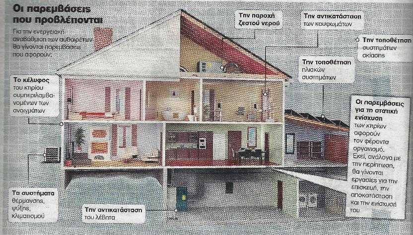 Σύμφωνα με πηγές από το υπουργείο Περιβάλλοντος, για το κόστος των εργασιών αλλά και τις απαραίτητες εργασίες θα ακολουθηθεί το πρότυπο του προγράμματος «Εξοικονομώ κατ’ οίκον». Σε αυτό προβλέπονται η αντικατάσταση των κουφωμάτων (πλαίσια/υαλοπίνακες), η τοποθέτηση συστημάτων σκίασης, η θερμομόνωση στο κέλυφος, η αντικατάσταση καυστήρα ή λέβητα αλλά και η τοποθέτηση ηλιακών συστημάτων.