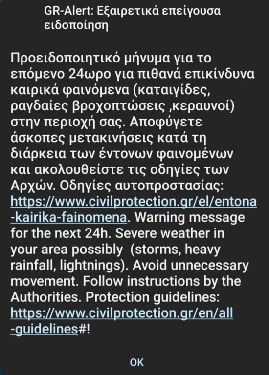 Αντίστοιχα μηνύματα έχουν σταλεί και σε άλλες περιοχές της Ελλάδας, ενδεικτικά στην Ηπειρο.