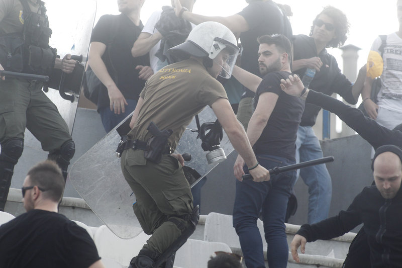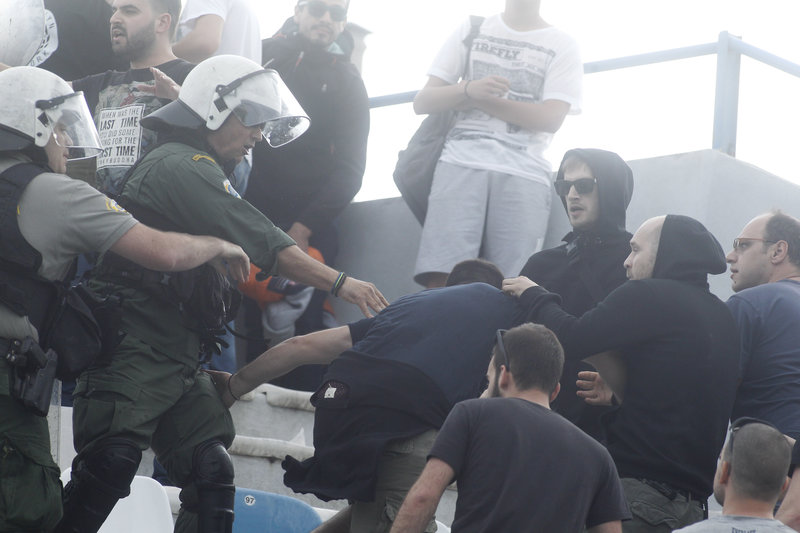 Μάχες «σώμα με σώμα» μεταξύ οπαδών και ΜΑΤ σημειώθηκαν στις κερκίδες του γηπέδου της Καλλιθέας, με τις αστυνομικές δυνάμεις να χτυπούν οπαδούς με τα γκλοπ.