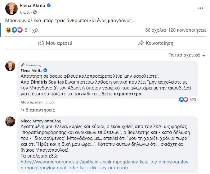 Στο πλευρό του Νίκου Μπογιόπουλου τάχθηκε η Έλενα Ακρίτα με ένα αιχμηρό σχόλια, μόλις εννέα λέξεων στο Facebook.