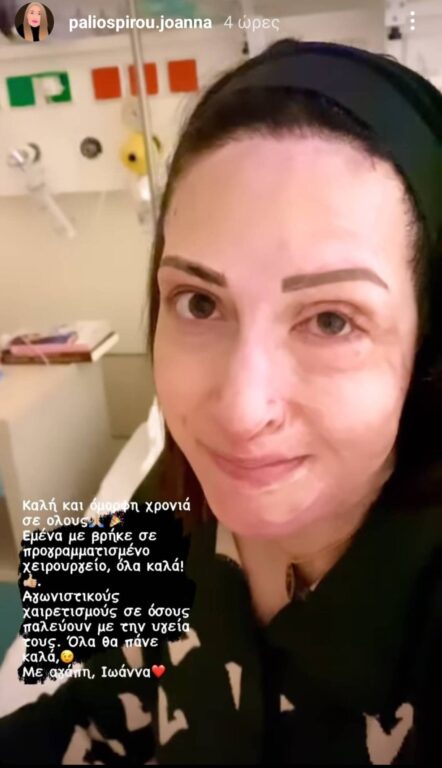 «Καλή και όμορφη χρονιά σε όλους. Εμένα με βρήκε σε προγραμματισμένο χειρουργείο όλα καλά. Αγωνιστικούς χαιρετισμούς σε όσους παλεύουν με την υγεία τους. ‘Ολα θα πάνε καλά. Με αγάπη Ιωάννα», γράφει χαρακτηριστικά η Ιωάννα Παλιοσπύρου.