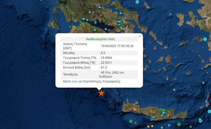 Σεισμός 5 ρίχτερ σημειώθηκε πριν από λίγο στην θαλάσσια περιοχή των Κυθήρων.