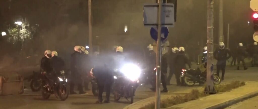Καπνογόνα και φωτιές παντού ενώ οι αστυνομικοί έκαναν χρήση δακρυγόνων και δημιούργησαν κλοιό για να προστατέψουν το συνάδελφό τους, που βρίσκονταν πεσμένος στο έδαφος, μέχρι να έρθει το ασθενοφόρο.