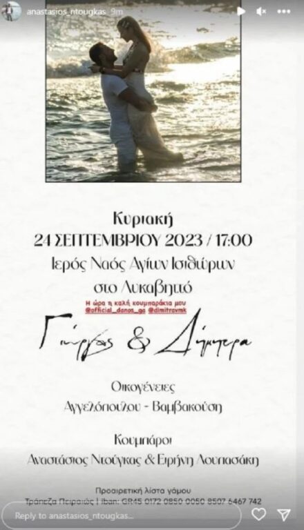 Ο δικηγόρος και φίλος του ζευγαριού Αναστάσιος Ντούγκας αποκάλυψε το χαρμόσυνο γεγονός, με story που έκανε στο Instagram.