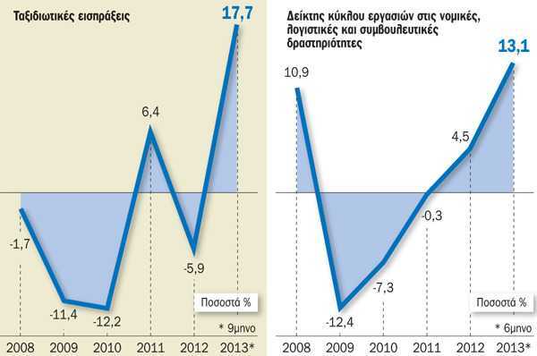 Ακολουθούν οι υπηρεσίες που παρέχουν οι δικηγόροι, οι συμβολαιογράφοι, οι λογιστές και οι σύμβουλοι επιχειρήσεων (+13,1%). Αξιοσημείωτη ήταν η αύξηση του τζίρου των αεροπορικών μεταφορών (5,1%), κόντρα στις εξελίξεις στις άλλες μεταφορές (χερσαίες και θαλάσσιες – ακτοπλοϊκές), αλλά και η αύξηση της παραγωγής τσιμέντου (4%), σε αντίθεση με το τι έγινε με τους άλλους τομείς της βιομηχανίας. Μεγάλη, όμως, ήταν και πέρυσι η πτώση της ιδιωτικής κατασκευαστικής δραστηριότητας (-31,6%) αλλά και του λιανικού εμπορίου (-10,3%). Ειδικά οι δύο τελευταίοι κλάδοι συνέχισαν και το 2013 να βρίσκονται σε ελεύθερη πτώση.