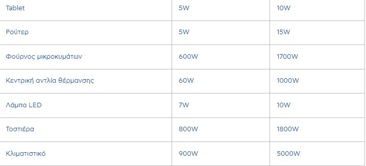 Συνεπώς, όπως φαίνεται και στον πίνακα, ο θερμοσίφωνας μπορεί να έχει ελάχιστη κατανάλωση 3.000W και μέγιστη έως 5.000W, ο φούρνος έχει ελάχιστη κατανάλωση 2.000W και μέγιστη 4.000W.