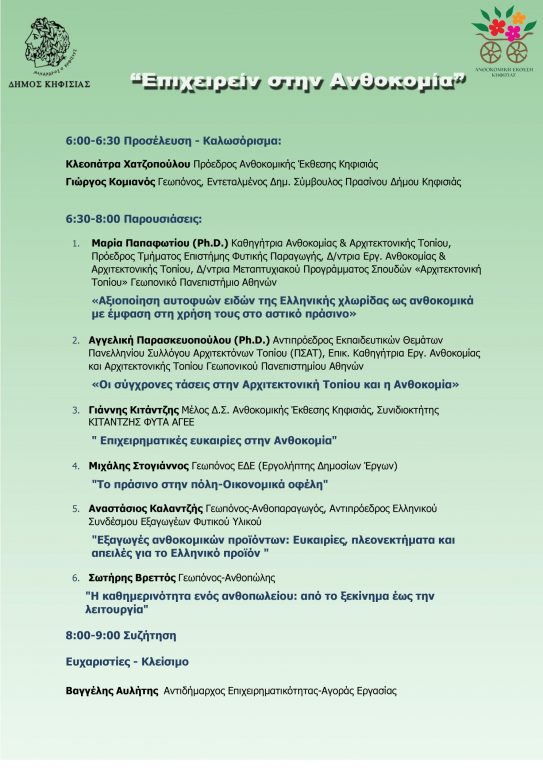 - Η κα.Αγγελική Παρασκευοπούλου (Ph.D.), θα αναφερθεί στις «Σύχγρονες τάσεις στην Αρχιτεκτονική Τοπίου και την Ανθοκομία».