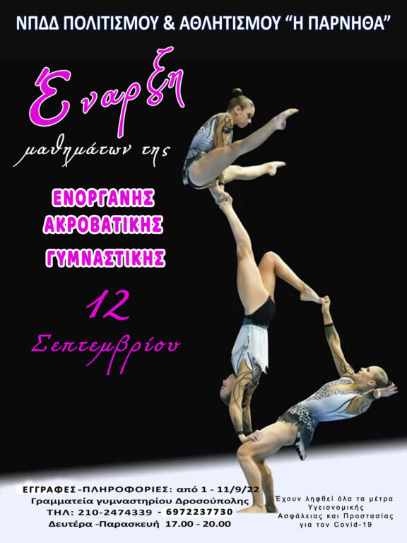 Την Δευτέρα 12 Σεπτεμβρίου 2022 γίνεται η έναρξη των μαθημάτων του τμήματος Ενόργανης και Ακροβατικής Γυμναστικής του ΝΠΔΔ