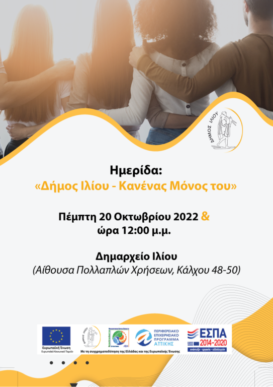 Η παρουσίαση της νέας Κοινωνικής Δομής, με παράλληλη ενημέρωση για όλες τις υπηρεσίες που παρέχει, θα πραγματοποιηθεί την Πέμπτη 20 Οκτωβρίου 2022 και ώρα 12:00 το μεσημέρι, στο Δημαρχείου Ιλίου σε ημερίδα με τίτλο «Δράσεις για την Αντιμετώπιση της Φτώχειας, την Προώθηση της Κοινωνικής Ένταξης και την Παροχή Υπηρεσιών Ανοιχτής Ειδικής Φροντίδας στο Δήμου Ιλίου Διαδημοτικά Κοινωνικά Δίκτυα “ΦΡΟΝΤΙ-ΖΩ” και “ΥΓΕΙΑ ΓΙΑ ΟΛΟΥΣ”».