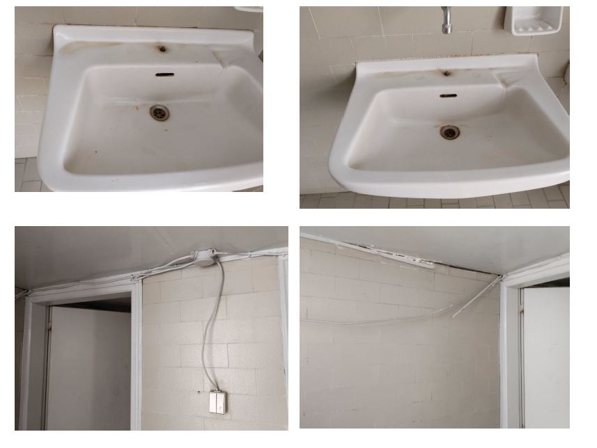 Εμφανείς ρύποι στην επιφάνεια του νιπτήρα, καθώς και ενδείξεις ελλιπούς συντήρησης του υγειονομικού εξοπλισμού. Απαράδεκτη κατάσταση που ενδέχεται να επηρεάζει τις συνθήκες υγιεινής του χώρου. Τεκμήριο καθημερινής συντήρησης, όχι μόνο δομικών προβλημάτων. Εκτεθειμένη καλωδίωση ηλεκτρολογικής εγκατάστασης στον χώρο υγιεινής.