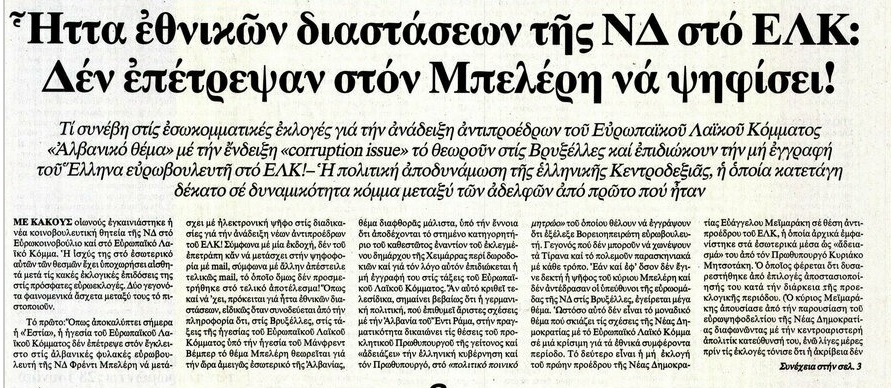 ΜΕ ΚΑΚΟΥΣ οἰωνούς ἐγκαινιάστηκε ἡ νέα κοινοβουλευτική θητεία τῆς ΝΔ στο Εὐρωκοινοβούλιο καί στό Εὐρωπαϊκό Λαϊκό Κόμμα. Ἡ ἰσχύς της στό ἐσωτερικό αὐτῶν τῶν θεσμῶν ἔχει ὑποχωρήσει αἰσθητά μετά τίς κακές ἐκλογικές επιδόσεις της στίς πρόσφατες ευρωεκλογές. Γεγονότα φαινομενικά ἄσχετα μεταξύ τους τό πιστοποιοῦν. Τό πρῶτο: Ὅπως ἀποκαλύπτει σήμερα ἡ «Εστία», ἡ ἡγεσία τοῦ Εὐρωπαϊκοῦ Λαϊκοῦ Κόμματος δέν ἐπέτρεψε στόν ἔγκλειστο στίς ἀλβανικές φυλακές ευρωβουλευτή τῆς ΝΔ Φρέντι Μπελέρη να μετάσχει με ηλεκτρική ψήφο στις διαδικασίες!