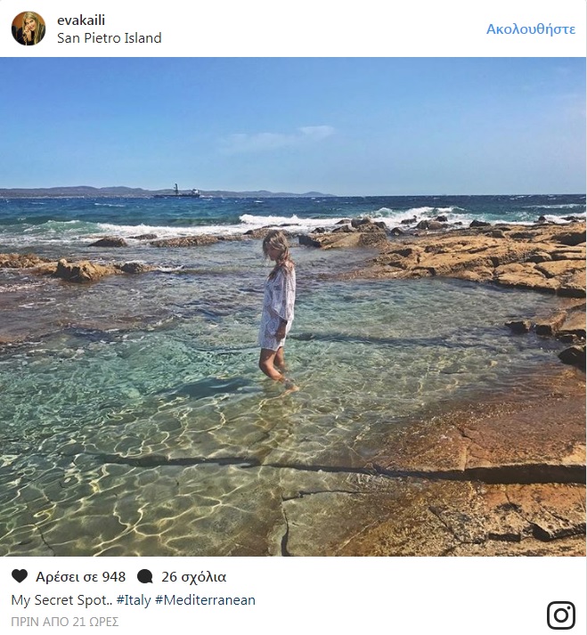 Η νεαρή πολιτικός, κάνει τις διακοπές της στο νησί San Pietro γνωστό για τα γαλαζοπράσινα νερά και τους εντυπωσιακούς βράχους του. Η Εύα, μοιράστηκε στην προσωπική της σελίδα στο Instagram φωτογραφία από το αγαπημένο της νησί και αποκάλυψε το κρυφό… αγαπημένο της σημείο.