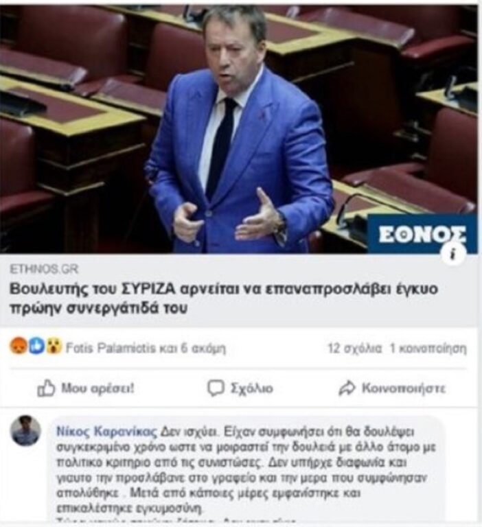 Καρανίκας: Στηρίζει δημοσίως Κόκκαλη στην απόλυση της εγκύου συνεργάτιδάς του (φωτο)