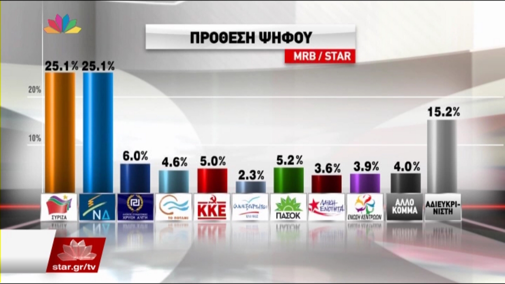 Απόλυτη ισοπαλία ΣΥΡΙΖΑ και ΝΔ σε δημοσκόπηση της MRB για το STAR