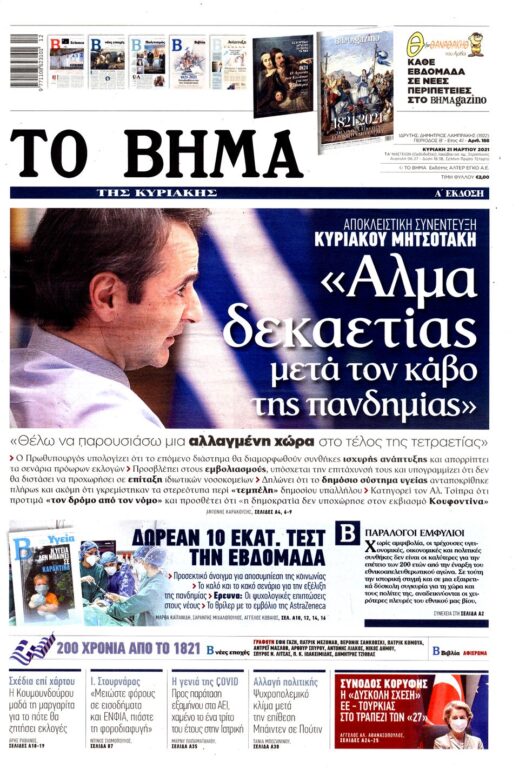 Ο κ. Μητσοτάκης δηλώνει ότι βασικός στόχος παραμένει μέχρι τα τέλη Απριλίου να έχουν εμβολιαστεί με τουλάχιστον μια δόση όλοι οι πολίτες άνω των 60 ετών και οι πάσχοντες από κάποιο βαρύ νόσημα, και εκφράζει την αισιοδοξία του ότι “φτάνουμε στο τέλος του πολέμου με τον κορονοϊό και στο τέλος θα βγούμε νικητές”. Εκτιμά ότι “παρά τις δυσκολίες η χώρα τα έχει καταφέρει πολύ καλύτερα από άλλες χώρες” και προσθέτει ότι “εάν η Ελλάδα είχε τον μέσο ευρωπαϊκό όρο σε απώλειες ανά εκατομμύριο κατοίκους, σήμερα θα θρηνούσαμε τα διπλάσια θύματα”.