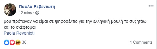 Πρόταση για να θέσει υποψηφιότητα στις επικείμενες εθνικές εκλογές με κάποιο από τα ελληνικά κόμματα η ακτιβίστρια και πρωτοπόρα του ελληνικού ΛΟΑΤ κινήματος, Πάολα Ρεβενιώτη.