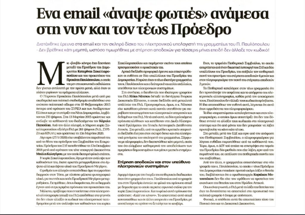 Τον υπόγειο “πόλεμο” μεταξύ της νυν και του τέως προέδρου της Δημοκρατίας περιγράφει σε ρεπορτάζ της η εφημερίδα “Πρώτο Θέμα”. Κατερίνα Σακελλαροπούλου και Προκόπης Παυλόπουλος δεν φαίνεται να έχουν τις καλύτερες των σχέσεων και αυτό αποδεικνύεται από τις… γραμματείς και τους συνεργάτες τους.