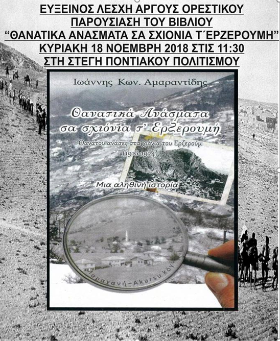 Η Εύξεινος Λέσχη Άργους Ορεστικού σας προσκαλεί στην παρουσίαση του βιβλίου του Ιωάννη Αμαραντίδη ‘’Θανατικά Ανάσματα στα σχίονια τ΄Ερζερούμη΄΄ . Η παρουσίαση θα γίνει την Κυριακή 18 Νοεμβρίου και ώρα 11:30 πμ στο θεατράκι του κτιρίου της Στέγης Ποντιακού Ελληνισμού Αργους Ορεστικού .