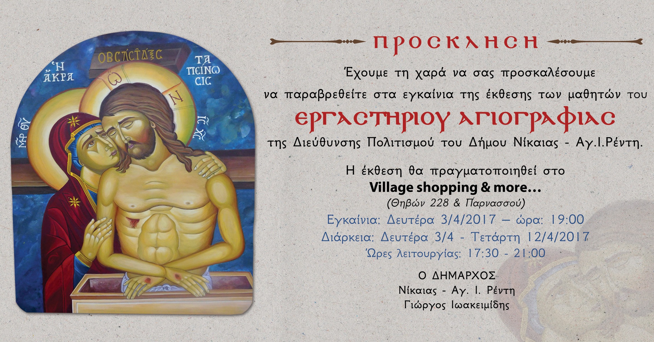 Η Διεύθυνση Πολιτισμού και το Εργαστήριο Αγιογραφίας του Δήμου Νίκαιας – Αγ. Ι. Ρέντη διοργανώνουν Έκθεση Αγιογραφίας έργων φορητής εικόνας των μαθητών του εργαστηρίου σε ειδικά διαμορφωμένο χώρο στο Village shopping and more… από τις 3 έως τις 12 Απριλίου. Την έκθεση θα εγκαινιάσει ο Δήμαρχος Νίκαιας- Αγ Ι. Ρέντη Γιώργος Ιωακειμίδης την Δευτέρα 3 Απριλίου στις 7 το απόγευμα.