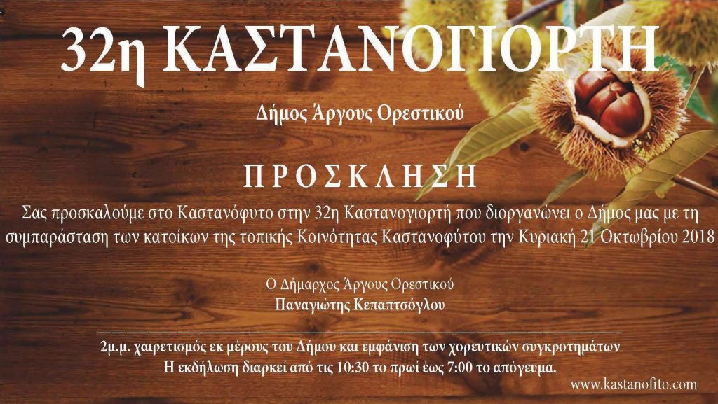 Ο δήμος Άργους-Ορεστικού διοργανώνει την 32η Καστανογιορτή την Κυριακή 21 Οκτωβρίου από τις 10:30 έως τις 7:00 το απόγευμα.