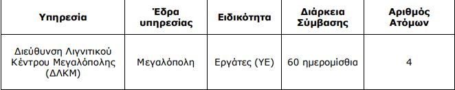 Η Διεύθυνση Λιγνιτικού Κέντρου Μεγαλόπολης (ΔΛΚΜ) ενδιαφέρεται για την πρόσληψη τεσσάρων (4) εκτάκτων ημερομισθίων ανειδίκευτων εργατών, με σύμβαση εργασίας ορισμένου χρόνου (60 ημερομίσθια), για την κάλυψη εποχικών ή παροδικών αναγκών της ΔΛΚΜ.