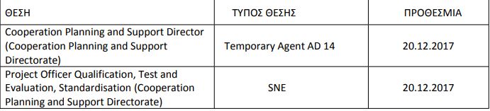 Σύμφωνα με το Α.Π. 8251/21-11-2017 έγγραφο της Μόνιμης Ελληνικής Αντιπροσωπείας στην Ευρωπαϊκή Ένωση (Μ.Ε.Α. στην Ε.Ε.), ο Ευρωπαϊκός Οργανισμός Άμυνας (European Defence Agency – EDA) δημοσιεύει την ακόλουθη προκήρυξη θέσεων με στοιχεία: