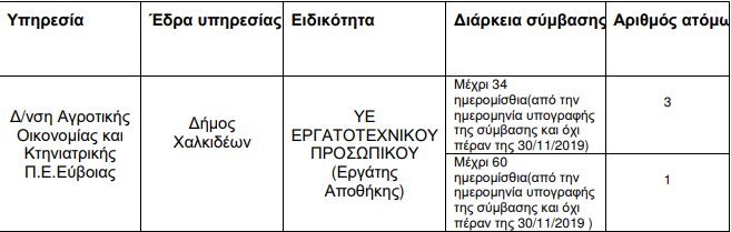 Η περιφέρεια Στερεάς Ελλάδας ανακοινώνει την πρόσληψη με σύμβαση εργασίας ιδιωτικού δικαίου ορισμένου χρόνου(ΙΔΟΧ) , συνολικού αριθμού τεσσάρων(4) ατόμων για την κάλυψη εποχικών αναγκών του Προγράμματος Καταπολέμησης του Δάκου της Ελιάς έτους 2019 της Δ/νσης Αγροτικής Οικονομίας και Κτηνιατρικής της Περιφερειακής Ενότητας Εύβοιας με έδρα τη Χαλκίδα ως κάτωθι: