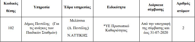 Ο Δήμος Πεντέλης ανακοινώνει την πρόσληψη, με σύμβαση εργασίας ιδιωτικού δικαίου ορισμένου χρόνου, συνολικά δύο (2) ατόμων για την κάλυψη εποχικών ή παροδικών αναγκών του ΔΗΜΟΥ ΠΕΝΤΕΛΗΣ, που εδρεύει στα Μελίσσια Ν. Αττικής.