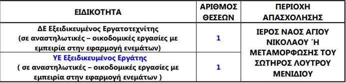 Το υπ. Πολιτισμού ανακοινώνει την πρόσληψη προσωπικού λοιπών ειδικοτήτων (εξειδικευμένου τεχνικού προσωπικού), με σύμβαση εργασίας ιδιωτικού δικαίου ορισμένου χρόνου, για την εκτέλεση των αρχαιολογικών εργασιών του υποέργου «ΣΤΕΡΕΩΣΗ ΚΑΙ ΑΠΟΚΑΤΑΣΤΑΣΗ ΙΕΡΟΥ ΝΑΟΥ ΑΓΙΟΥ ΝΙΚΟΛΑΟΥ Ή ΜΕΤΑΜΟΡΦΩΣΗΣ ΤΟΥ ΣΩΤΗΡΟΣ ΛΟΥΤΡΟΥ ΜΕΝΙΔΙΟΥ, ΠΕΡΙΦΕΡΕΙΑΣ ΑΤΤΙΚΗΣ» του έργου με τίτλο «ΑΠΟΚΑΤΑΣΤΑΣΗ ΙΕΡΟΥ ΝΑΟΥ ΑΓΙΟΥ ΝΙΚΟΛΑΟΥ Ή ΜΕΤΑΜΟΡΦΩΣΗΣ ΤΟΥ ΣΩΤΗΡΟΣ ΛΟΥΤΡΟΥ ΜΕΝΙΔΙΟΥ, ΠΕΡΙΦΕΡΕΙΑΣ ΑΤΤΙΚΗΣ» στο Ε.Π. «Αττική 2014-2020», για χρονικό διάστημα από την ημερομηνία υπογραφής της σύμβασης και για δώδεκα (12) μήνες, με δυνατότητα παράτασης ή ανανέωσης της σύμβασης, έως το τέλος του υποέργου, εφόσον αυτό συνεχισθεί, υφίσταται η σχετική χρηματοδότηση και οι ανάγκες του το επιβάλλουν.