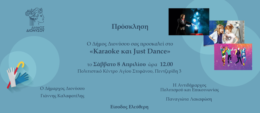 Ο Δήμος Διονύσου προσκαλεί τους μικρούς μας φίλους σε μία απίστευτη μουσική παράσταση που θα πραγματοποιηθεί το Σάββατο 8/4 στις 12:00 μ.μ. στο Πολιτιστικό Κέντρο Αγίου Στεφάνου και περιλαμβάνει χορό, τραγούδι και πολλή διασκέδαση. Θα υπάρχει μουσικό χαλί από έμπειρο Dj, παρουσιαστής, κλόουν που θα παρουσιάσει διαδραστικά παιχνίδια και μάγος που θα μαγέψει με τα […]