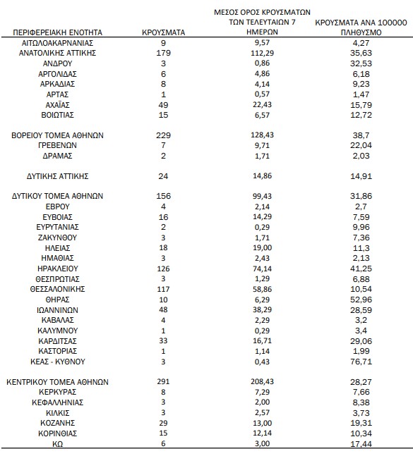 Ακόμα, το Ρέθυμνο καταγράφει 94 κρούσματα, ενώ η Λάρισα 53, η Αχαΐα 49 και τα Ιωάννινα 48.